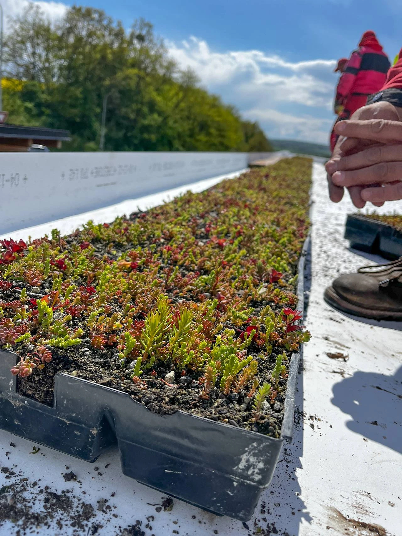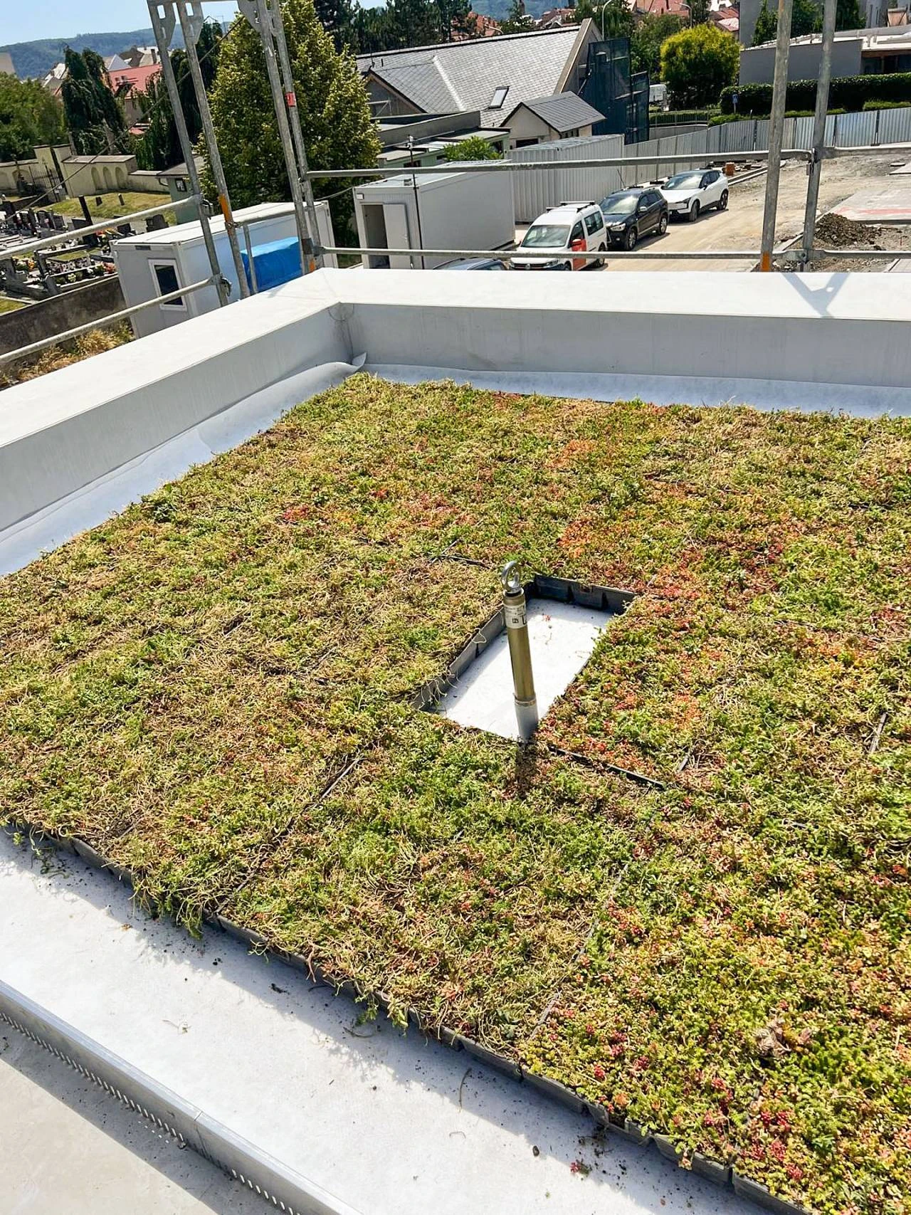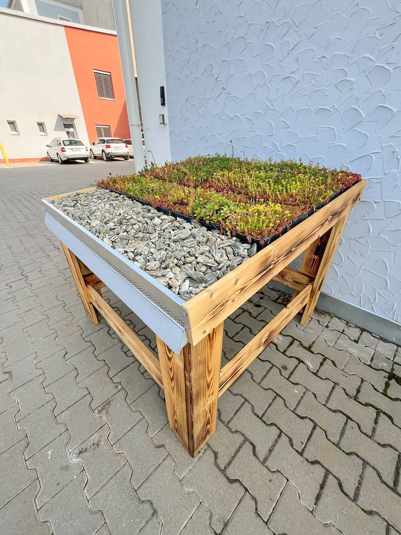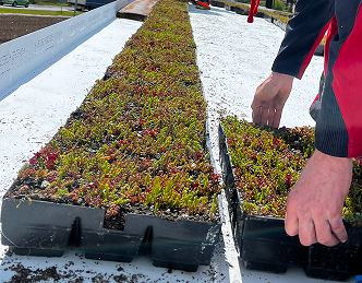 Předpěstovaný více druhový mix rozchodníkových rostlin (u perimetrické kazety doplněno o suchomilné traviny) vhodných pro naše klimatické podmínky v mobilních kazetách o rozměrech 600 x 300 x 90 mm nebo 588 x 388x 80 mm.