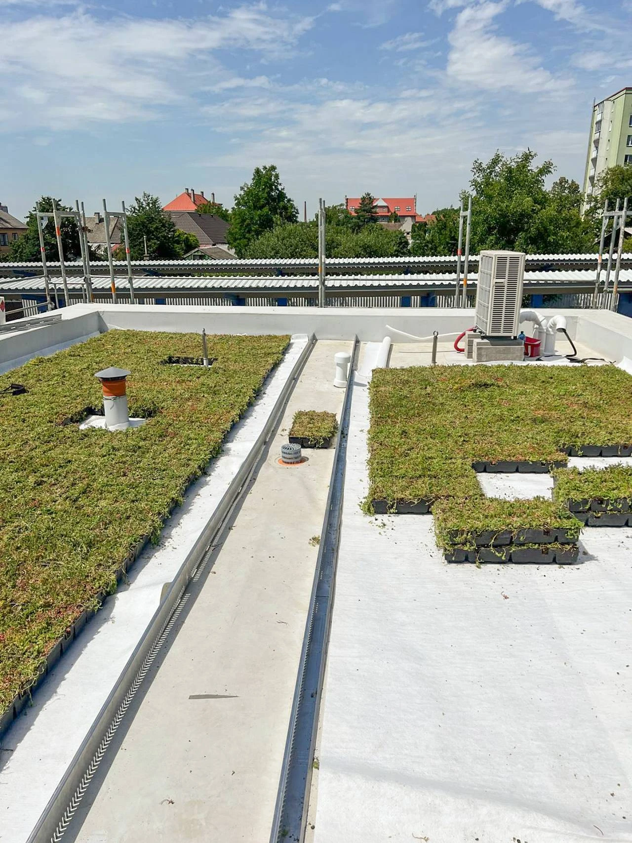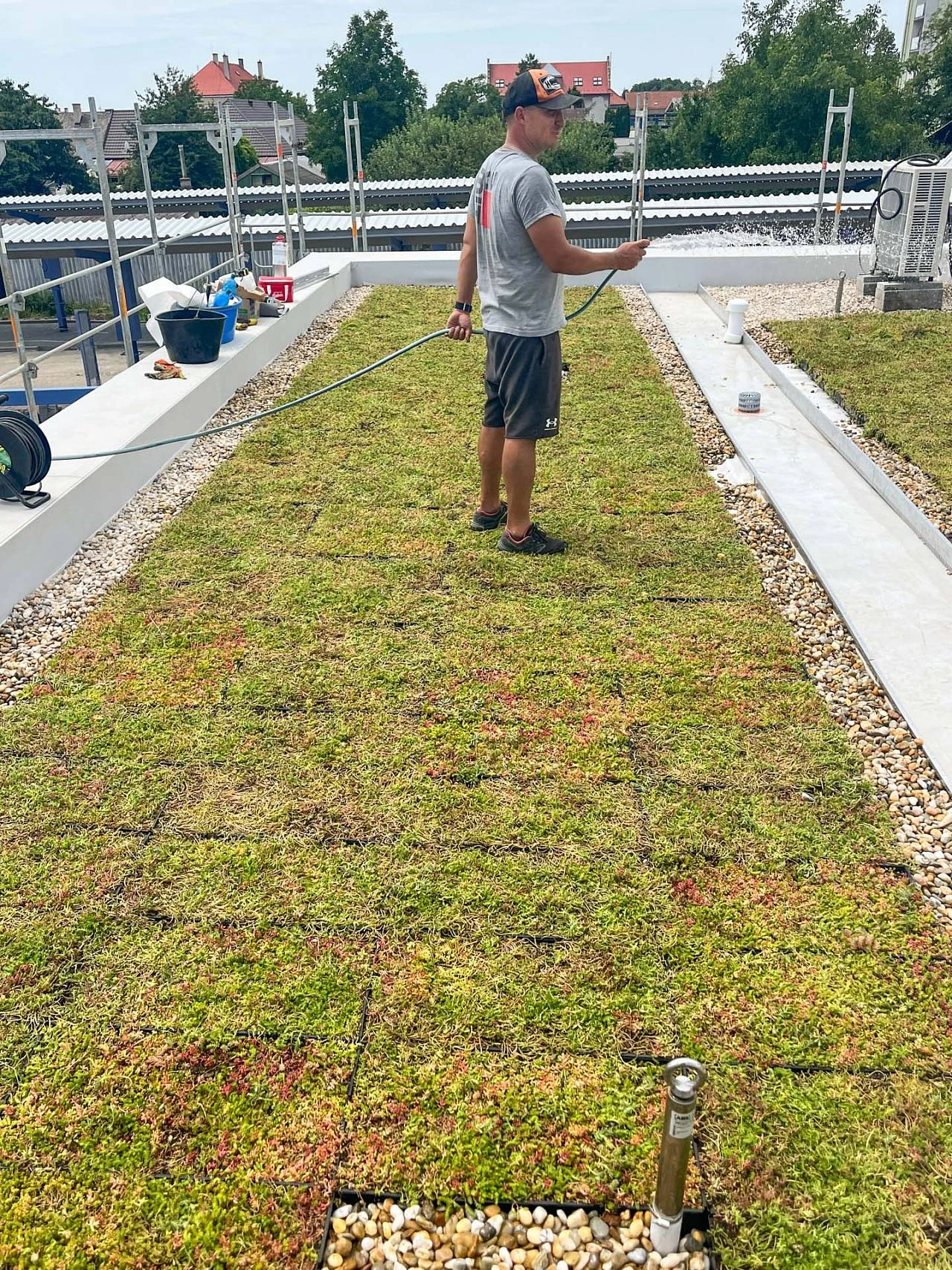 Kazety se pokládají těsně vedle sebe a spojují se k sobě zámky na k tomu určených stranách. Je možné je kombinovat nebo řezat podle tvaru střechy. Řezání provádějte nejlépe přímočarou elektrickou pilou. Řezná plocha by měla vždy směřovat dovnitř střechy. Před i během pokládky udržujte podklad bez nečistot a zbytků substrátu, aby nedošlo k poškození hydroizolace.